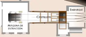 Este edificio albergó la máquina de extracción —no conservada— que era accionada mediante vapor y sus tambores transmitían el movimiento a las jaulas mediante cadenas en vez de mediante cables como es habitual.[3]