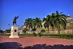 Justo en frente del castillo se encuentra una estatua del almirante español Blas de Lezo, comandante militar y defensor de Cartagena de Indias en 1741. Otro monumento ubicado en las cercanías del castillo son «las botas viejas», un sector histórico y de gran afluencia para los turistas. Las estatuas (dos pares de zapatos) fueron erigidas en 1943[18] en representación del poeta colombiano Luis Carlos López,[18] conocido con el apodo de El Tuerto, por el poema A mi ciudad nativa.[19] A unos pocos metros se encuentra la escultura de la India Catalina, quien fuera hija de un cacique y gobernante de una tribu; Catalina fue obra del escultor español Eladio Gil Zambrana.[20]