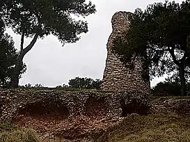 Permanece parte de una torre situada en la cima del monte, parcialmente derribada. Tenía una estructura cilíndrica de la que queda menos de la mitad. Está construida de mampostería con sillares irregulares. Tiene una altura aproximada de 12 metros.[2]