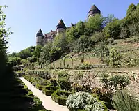 Los jardines medievales son espacios que están al pie de la ladera del castillo y que protegen las plantas de hortalizas y frutas de los vientos fríos. Son un testimonio de la historia de los jardines y un reconocimiento del saber hacer en los huertos cercados de la Edad Media, con el cultivo sostenible de plantas medicinales y de frutales. También son un ejemplo del arte de los Treillages y espalderas con una colección de rosas antiguas.[3]