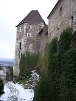 La torre sirvió en el siglo XV como la entrada principal al patio del castillo. Los habitantes antes del mismo estaban conectados con el mundo exterior por medio de dos puentes levadizos que atravesaban el foso de defensa. En el parte exterior se levantaba una colina, Lipnik, hecha artificialmente tan alta como las aberturas superiores. Pueden observarse también diferentes aberturas para el disparo de armas, ya que la fortaleza estaba adaptada a las armas más modernas. En el piso superior se encontraba la vivienda del encargado del edificio. La actualmente renovada torre no posee techo y está destinada a exposiciones, conciertos menores y obras de teatro. Frente a la entrada a la torre hay en el suelo una silueta de otra cisterna. La misma servía de aljibe o una salida secreta del castillo.