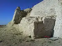 - Restos del alcázar árabe, del que se conservan varios tramos de murallas construidas con tapial, cuya fábrica se realizaba con una mezcla prensada de tierra, pequeños guijarros, trozos de cerámicas y algo de cal, que a juzgar por los materiales que se han sacado de su fosa de cimentación podría ser del siglo XI, de época almorávide. El perímetro de este nuevo castillo es sensiblemente mayor que el anterior.
