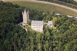 En la primera mitad del siglo XIV, se construyó el torreón pentagonal -todavía en pie- de 33 m de altura. Se menciona una segunda torre del castillo en 1346, pero ya no existe. En una disputa familiar en 1372, fue destruido el albergue de los guardianes del castillo.