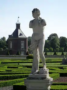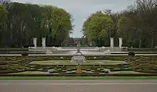 El frente del edificio da a un parque ajardinado de unas 170 hectáreas, al que se accede a través de un parterre formal de ondulantes broderias en el eje, flanqueado por extensiones de césped. Los jardines y los bosques que lo rodean están poblados por una multitud de estatuas de mármol de tamaño natural, de las cuales las primeras entregas se deben al escultor de Múnich Johann Wilhelm Gröninger y se realizaron en 1721. Otras esculturas fueron entregadas por Panhoff y Charles Manskirch. Se agregaron más esculturas durante la restauración en estilo neobarroco, realizada en 1903-1907.