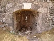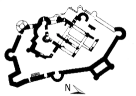 - Y hay una cerca que tiene seis cubos, y la dicha cerca diez pies de ancho. Item, tiene unos sótanos antes de llegar al patín a la redonda del alxibe, que son caballerizas, que podrán estar en ellas cien caballos, y sus portales y zaguán. Item, tiene la dicha fortaleza un patio enlosado y en medio de él un alxibe de agua, que tiene el patín a la redonda cien pasos, y el alxibe con mucha agua y buena, con ocho lumbreras de hierro y sus cerraduras, y corredores arriba. Item, hay una sala que se dice la Guardarropa arriba, que tiene muchas piezas y rodelas y escopetas y tiros pequeños de campo, y ballestas, y tiene la dicha sala dos ventanas con sus rejas. Hay otra sala, que se dice la Guardarropa de Abaxo, que tiene algunas corazas y armas viejas, y en ella hay una tahona, y tiene dos puertas y una ventana con reja grande. Item, hay treinta y cuatro aposentos altos y baxos en la dicha fortaleza. Item, una ronda en la dicha fortaleza, que tiene ciento y cincuenta y seis pasos, y doce ventanas, y cuatro aposentos y una campana, y una torre que se dice del Homenaje. Item, tiene la dicha fortaleza veinte rejas grandes de hierro a la redonda de la fortaleza. Item, cuatro tiros, los dos grandes y los dos pequeños, de hierro. Item, hay siete chimeneas en los aposentos, y está en un cerro armada sobre piedra.