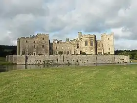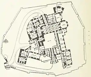 El Castillo de Raby tiene un plan irregular, con nueve torres a lo largo de su perímetro. La entrada principal estaba en el oeste a través del Puerta de Neville de cuatro pisos.[15] El acceso a la puerta de entrada se realizaba a través de un puente levadizo, que desde entonces fue reemplazado por una calzada enlosada.[4] La puerta de entrada originalmente contenía tres rastrillos, como lo demuestran las ranuras aún visibles que se usan para trabajarlos.[14] Dos torres más pequeñas al lado de la puerta de entrada no tienen función defensiva y se agregaron durante las renovaciones de Henry Vane, II conde de Darlington.