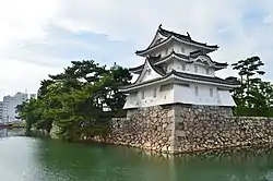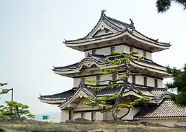 ![]() Reconstrucción de ushitora yagura, una de las torres vigía del castillo. | ||