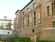 La estructura original más grande que sobrevive del castillo de la familia Pico son los restos del palacio Ducal, que denomina el lado del sur del castillo, frente al Teatro Nuovo. Antiguamente, en este ensanchamiento de la plaza Costituente, se organizó el mercado de los caballos.[17] La fachada está caracterizada por un pórtico noble que descansa sobre diez columnas de mármol rosa, hecho en nombre de Alejandro I Pico. Desde el pórtico, a través de una puerta arqueada perfilada en sillar, se encuentra la entrada al patio interior y la "Galleria Nuova". En la parte occidental del edificio están los restos del "bastión del castillo" del siglo XVI, reforzado en 1576 por Fulvia da Correggio y conectado a los poderosos muros con un plan estrellado con 8 puntas que defendían la ciudad.[18]