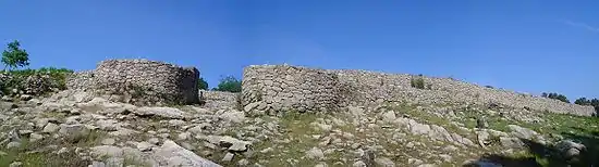 La acrópolis está delimitada por una muralla conformada por material granítico de la zona, contando con un espesor medio de 3 m. En su parte superior podría haber existido un paseo de ronda enlosado.[5]al que se accedería por medio de pasos situados lateralmente en el interior de la muralla[6] y por escaleras de diversa tipología, de uno o dos derrames, empotradas en el muro. La diversidad de escaleras de acceso a las murallas es algo presente en todo el sistema defensivo.