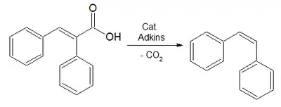 - Descarboxilación de ácido α-fenilcinámico para dar como producto el cis-estilbeno.[7]