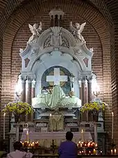 El altar central y los laterales fueron traídos igualmente de Italia y diseñados en 1938; tuvieron la desgracia de perderse al caer al río. Fueron nuevamente pedidos diez años más tarde, junto con el púlpito, el pavimento del presbiterio y el comulgatorio (barandilla) e inaugurados el 15 de septiembre del mismo año por el obispo Joaquín García Benítez. El atrio, que tiene 25 varas de largo por 10 de ancho (23,50 x 8,50 metros), fue cedido por el Municipio en canje por el terreno de la antigua capilla. Esta última ubicada en la mitad de lo que es hoy la plaza, en el sitio que ocupa el parque.