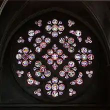 El rosetón de la catedral de Notre-Dame se instaló alrededor de 1205, antes de los rosetones de Chartres.[20] Sus vitrales, que se conservan casi por completo,[21] contribuyeron en gran medida al renombre de la catedral. En forma de mapamundi, Pierre d'Arras los pintó entre 1231-1235. Un dibujo del rosetón se encuentra en la colección de Villard de Honnecourt de 1270. Una restauración importante del transepto sur y del rosetón tuvo lugar en 1894-1909; el maestro vidriero Edouard Hosch recreó las pocas vidrieras que faltaban en el estilo del siglo XIII. Fue él quien inventó la figura de Dios padre que trona en el centro del rosetón, pero que no reproduce la vieja disposición. Originalmente, esta plaza central sin duda incluía la representación de Annus (el dios del año representado por el Creador), rodeado por el Sol (desplazado), Luna (desplazada), Dies y Nox (que no forman más que uno: Terra/Nox desplazado él también al rosetón).