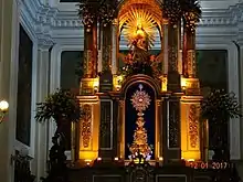 Su interior es espacioso y con mucha iluminación natural posee columnas cruciformes muy gruesas y en algunos casos se elevan 30 metros, su nave central se estaca por sobre las naves laterales y está rematada en el crucero por una gran cúpula altamente decorada de 35 metros de altura.