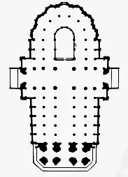 Está formada por dos naves concéntricas, cuyo arco de círculo tiene un radio de 23 metros y una superficie de 700 metros cuadrados aproximadamente. Su muro es festoneado por siete capillas, cada una de las cuales la forman tres planos, correspondientes a los tramos del ábside exterior. De norte a sur, son: