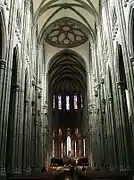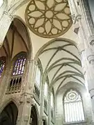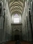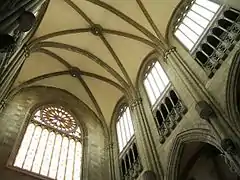 A todo lo largo de la nave central y el crucero, entre la ventanas y los arcos formeros, discurre un hermoso triforio. Cada tramo de triforio se divide en tantos arquillos y maineles como calles y parteluces segmentan las vidrieras superiores. Las vidrieras son de vidrio blanco excepto las que ocupan los testeros de los dos extremos del crucero; éstas son, como se anticipó arriba, vidrieras con rosetón y están coloreadas al igual que las que hacen la función de tímpano de las portadas de acceso bajo ellas. Igualmente coloreada es la gran ventana-rosetón que preside la fachada principal.