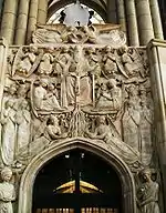 Ocupando el paño central, el relieve de la Puerta del Paraíso constituye una exaltación de la Santísima Trinidad, formando un Árbol de la Vida a cuyos pies discurre la Fuente de la Vida. De la escena de majestad dividida participan ángeles, arcángeles, santos, vírgenes y ancianos.