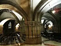 Las siete capillas se encuentran divididas por seis grandes columnas de fuste múltiple cuyos capiteles, corridos a modo único relieve secuencial, narran los siguientes temas: Pecados Capitales (I), Obras de Misericordia, Escenas del Nuevo Testamento, Obras de Misericordia, Pecados Capitales (II), Temas Varios. La iconografía es asimismo muy variada e imaginativa, mezclando las escenas religiosas y las profanas (fantasías mitológicas, naturaleza, crítica social), en los capiteles adosados a las paredes de la cripta. En estos trabajos los autores destilan una ironía en la que se conjugan la crítica social con el aleccionamiento moral.