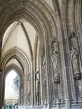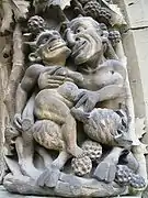 Los motivos escultóricos más llamativos de este conjunto son los de las arquivoltas de los ventanales de la cripta, donde proliferan los aspectos lúgubres de la vida terrenal y de ultratumba, mezclados con escenas profanas y seres fantásticos en actitudes violentas. En algunos casos las figuras recuerdan en su estilo los grutescos del arte Plateresco.