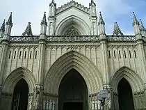 Orientada a los arranques de las calles Becerro Bengoa y Prado, la fachada, aún desprovista de torres, presenta un alto frente, abierto en su parte inferior por el pórtico o nártex dispuesto en tres grandes arcos apuntados, de mayor tamaño el central, y en la parte superior por un gran rosetón-vidriera sobre la terraza. Mide 22 metros de altura y se apoya en ocho machones dispuestos en dos filas de a cuatro. Los vértices de las aristas está coronados por pináculos neogóticos estilizados. El remate de la nave central, coronado por una cruz, lleva una orla de arquerías ciegas en su parte superior. Sobre el crucero de la nave se eleva un corto y macizo cimborrio cuadrado.
