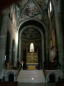 El interior es a cruz latina, con tres naves, divididas entre sí por veinticinco enormes pilares cilíndricos. El transepto también está dividido en tres naves. En el cruce hay un tiburio octogonal, decorado con frescos del siglo XVIII.