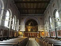 Tras el altar está el inmenso ábside, embellecido con frescos al óleo en 1864 y 1865 por Josef Settegast, de la Escuela de Dusseldorf. Esta obra pictórica busca plegarse al diseño original del arquitecto Hetsch. En la bóveda, una imagen de la Trinidad, con una representación de Dios Padre y el Espíritu Santo en los más alto, una fila de querubines y Jesucristo mayestático rodeado de los doce apóstoles. En la parte de en medio del ábside, una representación sedente de María; rodeándola, seis pinturas de santos nórdicos.