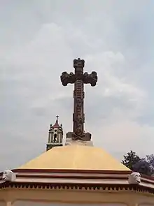 El 25 de agosto de 1555 se colocó la monumental cruz atrial en el eje del primer templo, Es la cruz atrial más alta de México y quizá la más importante por su estado de conservación y compitiendo el belleza con la de Acolman y Huichapan. La cruz tiene un altura de 4.48 metros, está tallada en cantera y se erige sobre una base octagonal de 3 metros de altura con columnas salomónicas en cada uno de sus ocho lados y la cruz en sí está rematada elegantemente por flores de Lis en cada extremo.