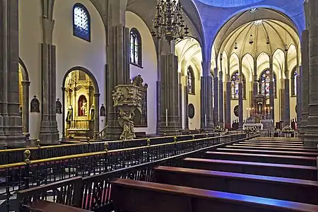 En su interior destaca el púlpito de mármol italiano de Carrara tallado por Pasquale Bocciardo y, también parte del conjunto del Retablo de Mazuelos. Sobresalen además obras de gran valor de Cristóbal Hernández de Quintana, Luján Pérez y Fernando Estévez. La catedral posee tres amplias naves y una girola (elemento insólito en Canarias) que rodea al presbiterio o altar, resultado de la ampliación de la nave mayor. El altar está dominado por grandes vitrales verticales. Estos elementos confieren al interior de la catedral un estilo típicamente medieval europeo y no tanto colonial, como sin embargo sí ocurre en el exterior de la catedral. En el interior de la catedral se conservan las reliquias de los mártires; San Aurelio de Córdoba, San Faustino, San Venusto y San Amado de Nusco,[4] además de un pedazo del manto de San Fernando y un hueso de Santiago el Menor. Pero las reliquias más destacadas del templo son las de los dos santos canarios, San Pedro de San José Betancur (el Hermano Pedro) y San José de Anchieta. Las imágenes históricamente más veneradas de la catedral junto a la Virgen de los Remedios, son: San Antonio de Padua y el Sagrado Corazón de Jesús.[4]