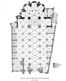 ![]() Planta actual (Eugène Lefèvre-Pontalis, Monographie de l'église Saint-Maclou de Pontoise, Pontoise, A. Pâris, 1888, planche I) | ||