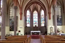 Entre sus obras de arte más significativas destacan los vitrales del presbiterio, ya que no hay retablo, y una Madonna de Rafael donada por la reina Josefina.