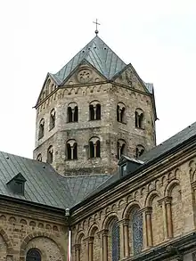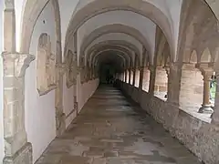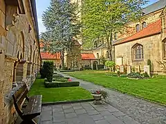 El claustro está adosado a la iglesia, en el lado sur de la nave. Tiene pilares-arcadas abiertos en los tres lados restantes. En el ala oriental están presentes capiteles de cojín, que corresponden a los del antiguo coro occidental de 1140. La bóveda de cañón en la parte oriental del claustro presenta lunetos pero sin arcos fajones; las bóvedas de las alas sur y oeste están sostenidas por arcos fajones y arcos ojivales (construidos en el segundo cuarto del siglo XIII). Durante la Segunda Guerra Mundial, el claustro, que había sido amurallado hacia el patio, sirvió como refugio antiaéreo.