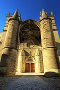 La catedral tiene una fachada principal muy poco habitual, con dos grandes pilares exentos (de 4,55 m de diámetro) y un baldaquino delante del portal principal, casi los únicos restos originales de la primitiva iglesia monacal del siglo XIV y que ahora son puramente decorativos. El portal gótico lateral, inaugurado en 1875 y consagrado a la Virgen, es obra del escultor Auguste Baussan.