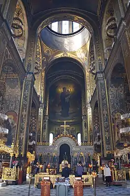 El colorido interior de la catedral es particularmente llamativo. Sus mosaicos fueron ejecutados por maestros de Venecia. Los frescos fueron creados bajo la guía del profesor Adrián Prájov por un grupo de pintores famosos: Wilhelm Kotarbiński, Mijaíl Nésterov, Mykola Pymonenko, Pável Svedomsky, Víktor Vasnetsov, Mijaíl Vrúbel, Víktor Zamyraylo (1868-1939) y otros. La pintura de la Santa Madre de Dios de Vasnetsov en el ábside del altar de la catedral impresiona por su austera belleza.