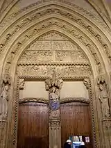 En el portal central se relata la vida de la Virgen. El registro central trata de la Ascensión, Pentecostés, el viaje de los apóstoles y la muerte de María y se remata con la escena de la coronación de la Virgen por su hijo. El tímpano de este portal está ocupado por una imagen de la Virgen con el niño del siglo XV.