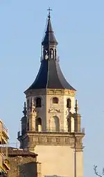 Entre los siglos XVI y XVIII se levanta, sobre el primer tramo del pórtico, la torre campanario. Esta torre está realizada en sillería en su fachada principal, la sur, que da a la plaza y en mampostería en los otros tres lados. Sobre el fuste se construyó una gran cornisa de buena cantería y sobre la que va el cuerpo de campanas de planta octogonal y sobre este el chapitel de madera y teja plana (se tuvo de reconstruir tras la destrucción en un incendio en el siglo XIX).[3]