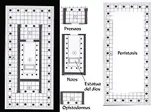 - En la vista lateral se pueden apreciar columnas de estilo dórico que han servido de sujeción a lo que antes era la cella del templo y sobre las cuales ahora hay cornisas (en la parte de la fachada) y otros elementos decorativos propio de barroco.