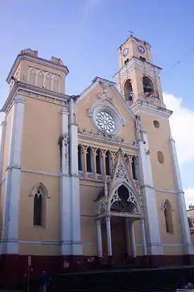 La fachada principal consta de tres cuerpos, todos en estilo neogótico. El primero consta de un frontón levantado por columnas esbeltas, el cual forma un arco ojival trilobulado. En el segundo cuerpo están las ventanas del coro (siete en total), de forma ojival. El tercer cuerpo, está rematado por un rosetón.