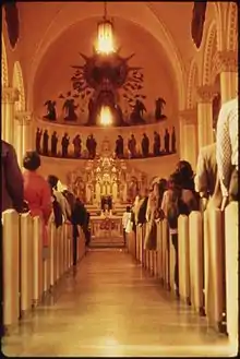 La presencia católica en New Ulm puede rastrear sus orígenes en la obra misionera de la Rev. Franz Weninger, SJ a mitad del siglo XIX. La primera iglesia era una estructura de madera construida en 1858. La construcción de la iglesia resultó ser lenta y fue destruida por los defensores de New Ulm antes de que se completara de manera que los miembros de la tribu Dakota no pudieran utilizarla como una barricada en el guerra de 1862 en Dakota.