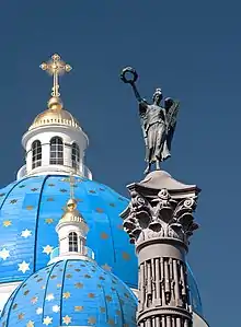 La construcción de la nueva iglesia comenzó en mayo de 1828 y la catedral se consagró en 1835. El edificio tiene una altura de más de 80 metros y domina la silueta urbana de la zona. En sus muros se pusieron placas en memoria de los oficiales del regimiento muertos en batalla, así como banderas y trofeos de guerra conseguidos por el regimiento durante las campañas de 1854-1855 y 1877-1878. La Catedral de la Trinidad era famosa por su colección de iconos. En 1867, Fiódor Dostoievski celebró en ella su boda con Anna Grigórievna Snítkina.[1] Para conmemorar la victoria en la Guerra Ruso-Turca (1877-1878), se construyó un monumento en forma de columna delante de la fachada norte de la catedral durante el año 1886.