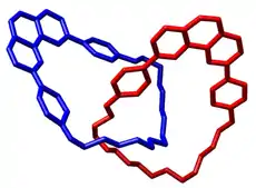 Un catenano es una estructura molecular mecánicamente entrelazada que está compuesta de dos o más macrociclos entrelazados. Los anillos entrelazados no se pueden separar sin romper los enlaces covalentes de los macrociclos. La palabra catenano deriva de la palabra latina catena que significa en cadena. Un catenano es un sistema molecular orgánico entrelazado donde dos o más moléculas cíclicas se interpenetran unas a otras. Usando esta nomenclatura un 2-catenano tiene dos anillos entrelazados y un 3-catenano, tiene tres. En 1994 un catenano fue reportado poco después de los juegos olímpicos de Lillehammer, este 5-catenano fue llamado olimpiadano por el parecido al símbolo usado en los juegos olímpicos.