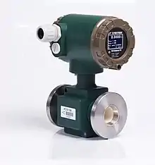 Un caudalímetro magnético o medidor de flujo magnético (en inglés: mag meter, electromagnetic flow meter) es un transductor que mide el flujo de un fluido por la tensión inducida a través del líquido por su flujo a través de un campo magnético. Se aplica un campo magnético al tubo dosificador, lo que resulta en una diferencia de potencial proporcional a la velocidad del fluido perpendicular a las líneas de flujo. [1]