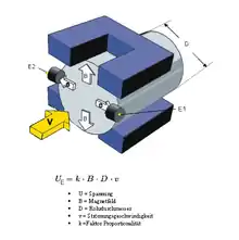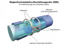 El principio físico de funcionamiento es la inducción electromagnética. El medidor de caudal magnético requiere un fluido conductor, por ejemplo, el agua que contenga iones, y una superficie de tubería eléctrica aislante, por ejemplo, un tubo de acero revestido de goma. [2]