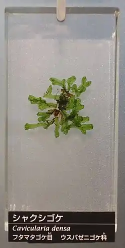 Cavicularia densa es la única especie del género de Marchantiophyta Cavicularia.[2] Se distingue de Blasia por la ausencia de un collar alrededor de la base de la cápsula esporófito, y una disposición agrupada de los anteridios productores de esperma.