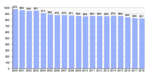 Gráfica de evolución demográfica de Cayón[2] entre 2000 y 2018 |
