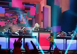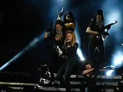 El segundo sencillo, «Revolver», fue lanzado el 14 de diciembre de 2009,[169] aunque también fue puesto a la venta como maxi sencillo digital en Europa y los Estados Unidos, el 29 de diciembre, junto con remezclas de David Guetta y Afrojack, así como de Paul van Dyk y Tracy Young. Además, estuvo disponible en maxi sencillo en CD el 22 y 26 de enero de 2010, en los Estados Unidos y Europa, respectivamente y en vinilo de 12" el 5 y 9 de febrero.[170] «Revolver» cuenta con la participación del rapero Lil Wayne, quien canta una estrofa hacia el final del tema con versos que hablan sobre municiones.[51] El tema, que pertenece al género electropop,[13] tiene referencias al amor y las armas, reflejado en la línea del estribillo My love's a revolver, my sex is a killer, do you wanna die happy? —«Mi amor es un revólver, mi sexo es asesino, ¿quieres morir feliz?»—.[171] Por otro lado, los críticos no quedaron satisfechos con el tema; un editor de Digital Spy lo describió de «desechable» y comentó que podría ser extraído de algún álbum de Britney Spears.[172] Además, la consideraron poco atrapante y sin comparación con las canciones anteriores de la artista.[173] No obstante, Joseph Brannigan Lynch, de Entertainment Weekly, elogió el verso del estribillo My love's a revolver.[173] Comercialmente hablando, «Revolver» no obtuvo una buena recepción, pues solo llegó a los diez primeros lugares en Finlandia, en la posición 6.[174] Por su parte, en la lista Dance/Club Play Songs de Billboard, la canción se ubicó en el cuarto lugar.[175] Tanto «Celebration» como «Revolver» fueron interpretadas en la novena gira de Madonna, The MDNA Tour, realizada en el año 2012,[176][177][178][179] e incluidas posteriormente en el álbum en directo MDNA World Tour, publicado el 10 de septiembre de 2013.[180]