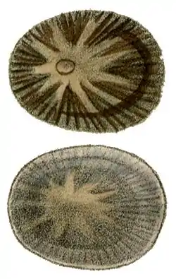 Black and white drawing of the shell of Cellana stellifera. Lateral view (right side). Head region is on the right.