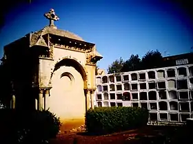 En las dos áreas que se extienden por delante de la Capilla, bordeando el camino que conduce hacia la misma, se levantan hermosas sepulturas de cantería y mármol de la época romántica. En el ángulo izquierdo de la cabecera del cementerio se levanta el interesante panteón de la familia Bretillard; el derecho está ocupado por un pequeño compartimento destinado a los no católicos. El recinto está totalmente cercado por un cerramiento de mampostería, pero, como es característico, en uno de sus frentes se abre la entrada principal, flanqueada por dos robustas pilastras de piedra labrada.