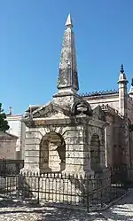 - Heredia (1852): El panteón, adosado a la capilla del cementerio, es una de las construcciones funerarias más destacadas del cementerio. El proyecto es de autor desconocido y fue traído desde Londres aunque la construcción la dirigió el arquitecto Cirilo Salinas. La parcela de planta rectangular con un ábside en su parte frontal está delimitada por una verja de hierro fundido. Algunas tumbas rodean el edificio principal, una de ellas con una remarcable escultura de un ángel. Una fuente octogonal se ubica junto a la puerta de acceso en la verja. El edificio funerario es de planta rectangular con forma de templo clásico dórico cuyas columnas, encastradas en los muros del edificio, y los festones que penden de antorchas invertidas, todas de hierro fundido, fueron realizadas en la fábrica de Heredia. En las dos fachadas laterales hay sendos accesos al interior cerrados con sólidas puertas también de fundición. El tímpano acoge un grupo escultórico de terracota sobre el Juicio Final. Y en su interior, separado por una verja tras el altar de la capilla, el monumento escultórico construido en memoria de Manuel Agustín Heredia e Isabel Livermore, realizado en mármol blanco por artistas italianos con diseño del afamado escultor neoclásico italiano Lorenzo Bartolini.[6] En él se representan las ocupaciones y virtudes del finado mediante cinco alegorías que representan las Matemáticas, la Minería, la Caridad, la Navegación y la Agricultura.