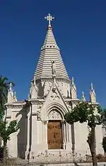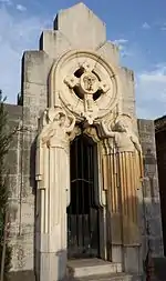 - Félix Sáenz Calvo (1933): Se considera uno de los panteones con mayor valor arquitectónico y está incluido en el Catálogo de Arquitectura Contemporánea de la Junta de Andalucía.[7] De claro estilo art decó fue realizado en 1933 por al arquitecto Antonio Palacios en piedra caliza blanca despiezada en sillares muy regulares, pero fue el escultor Francisco Palma García el que se encargó de los pormenores decorativos, entre ellos de los ángeles columnarios tallados en mármol blanco, de clara simbología eucarística, ya que sustentan sobre sus cabezas una gran forma circular moldurada y horadada en el interior para configurar un rosetón al que se superpone una cruz cuyo centro es un rostro de Cristo. La vidriera de tonalidades ámbar y amarilla se realizó en un taller especializado de París, Casa Maumejean, y nos muestra una cruz de malta con el crismón en el nudo y con el brazo inferior alargado para configurar una espada.