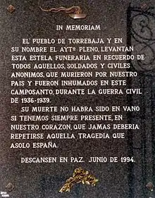 - Detalle del monumento "In memoriam" de los fallecidos durante la Guerra Civil Española (1936-39) e inhumados en el cementerio municipal de Torrebaja, en su primitivo emplazamiento (2009).
