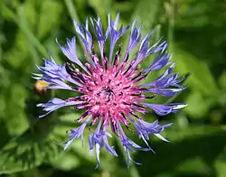 Crece hasta los 30-70 cm de altura y se pueden distinguir de otras especies de Centaurea en la región por sus hojas y flores de color azul púrpura de los rayos floridos, también Puede ser distinguirse de la Centaurea cyanus por tener una sola (rara vez hasta tres) cabezas de flores, y por ser perenne, mientras que C. cyanus tiene muchas cabezas de flores y es anual. Florece principalmente de mayo a agosto.